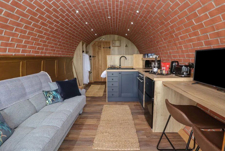 A hobbit-pod hideaway with big-sky views and serious peace – Rhosydd is the kind of rural escape where shoulders drop on arrival. Floor-to-ceiling windows frame rolling hills, while a fenced garden and covered alfresco lounge keep wet noses contained and humans cosy whatever the weather.